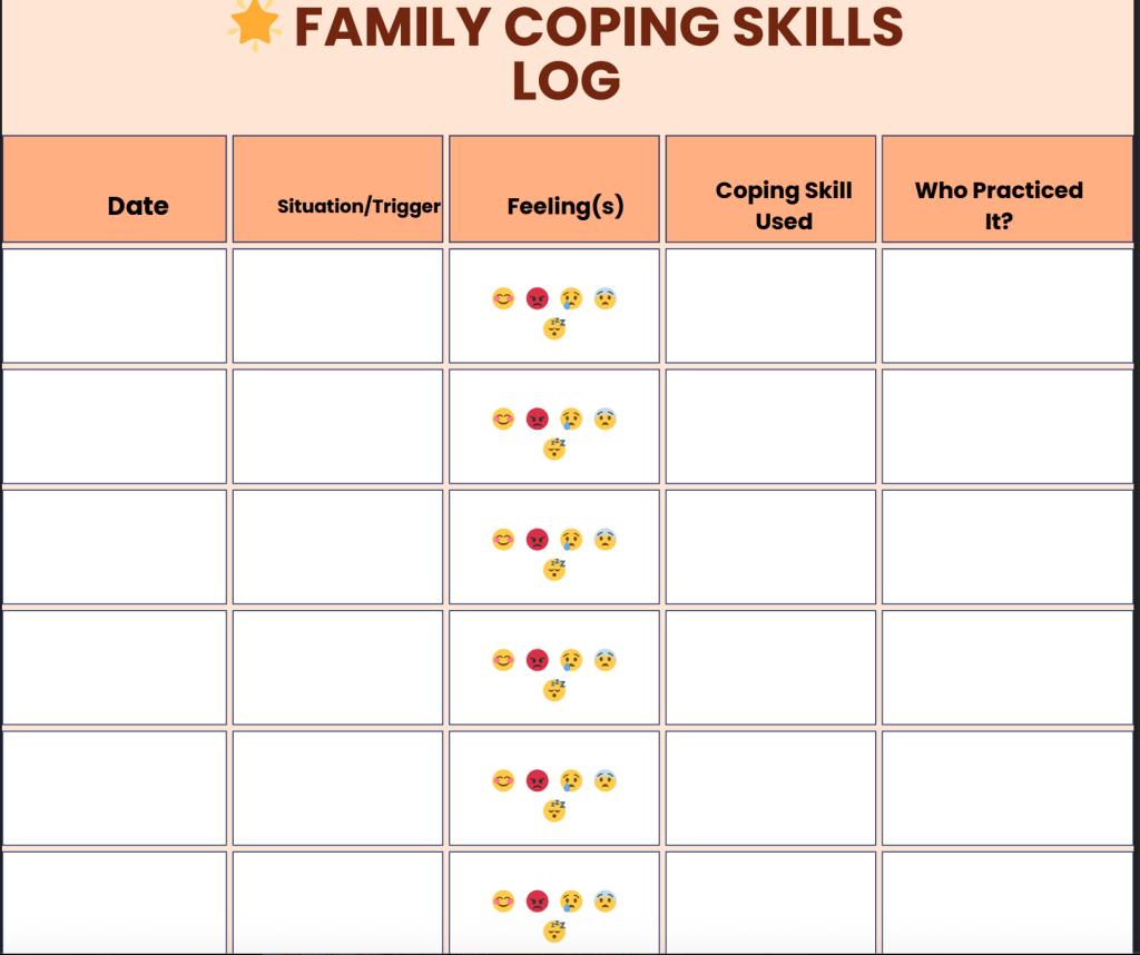 Some families like to keep track of what actually helps their child regulate by using a Family Coping Skills Log — a shared space to note which strategies work on hard days, anxious days, or overstimulated days. This shifts the focus from “What’s wrong?” to “What helps?”