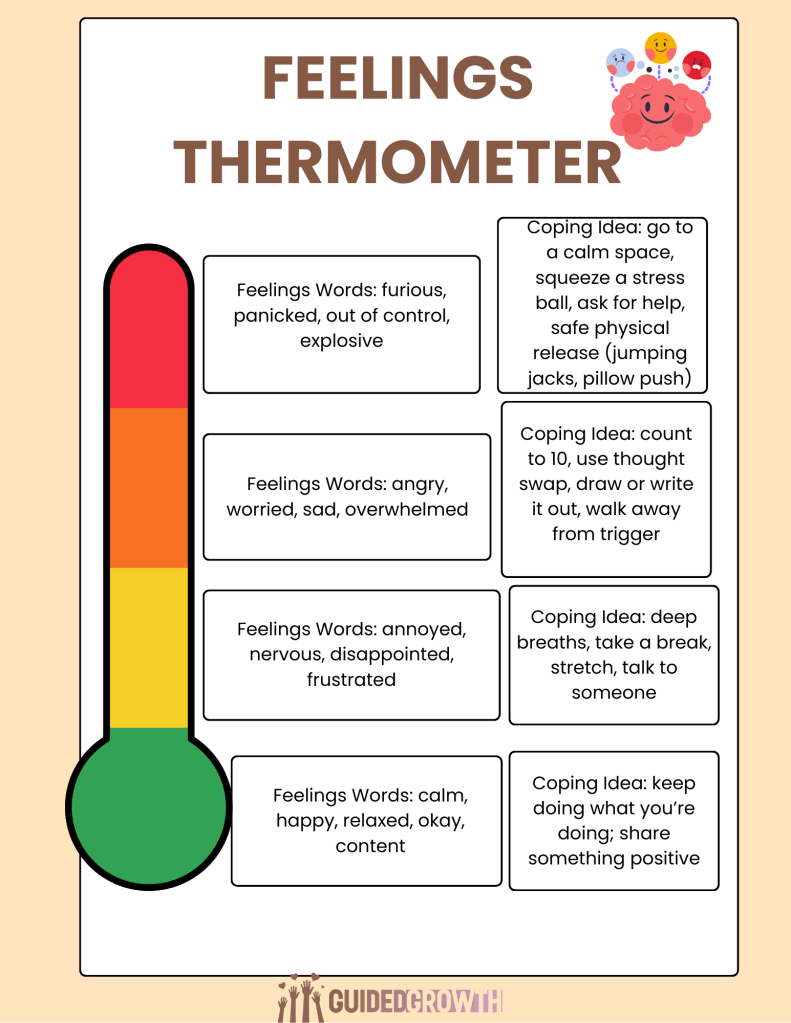 Help kids recognize and name their emotions with this simple, visual thermometer. It guides children in identifying their “temperature” (calm, warming up, upset, or very upset) and connects each level with coping strategies they can try right away.
